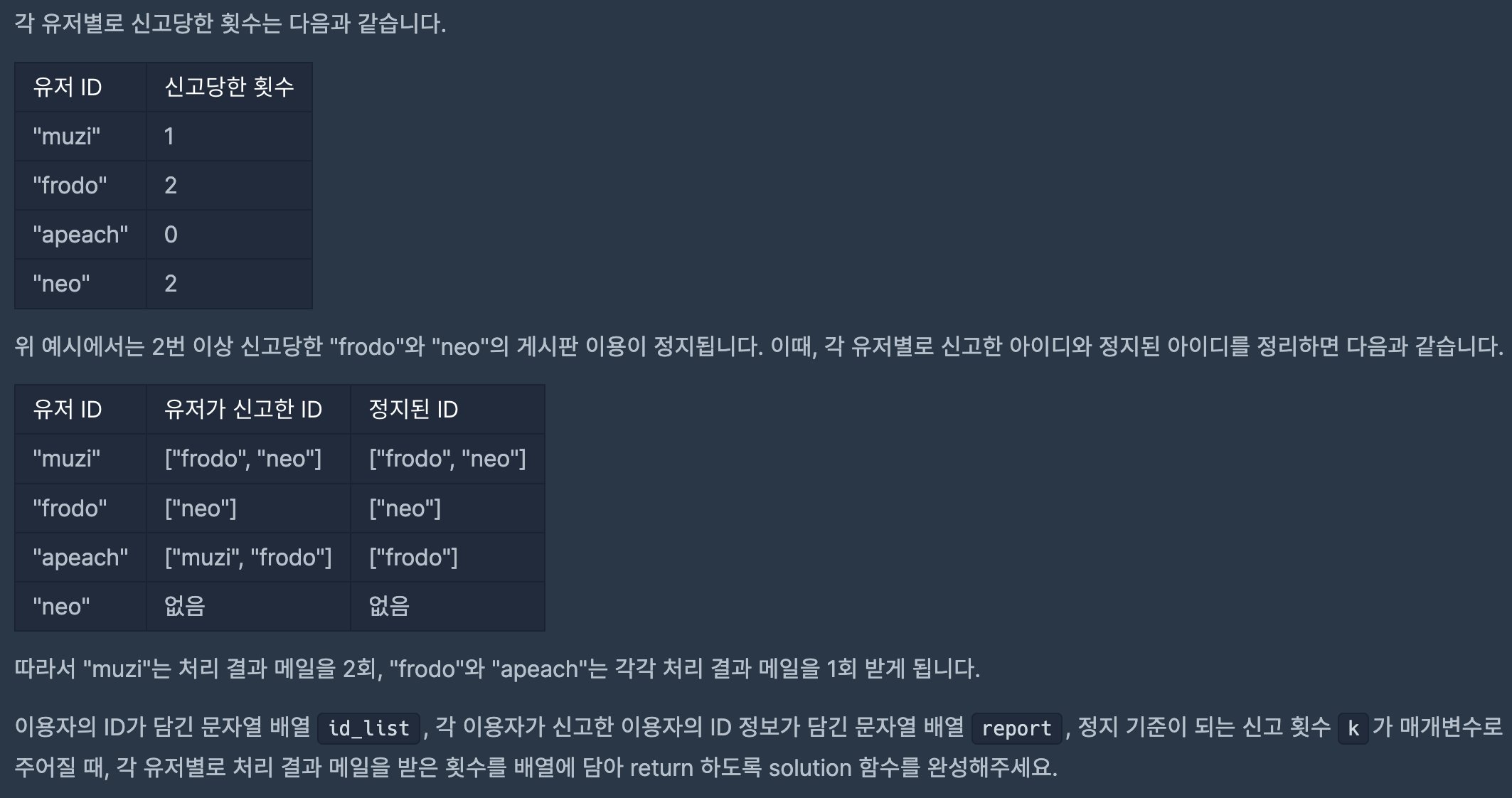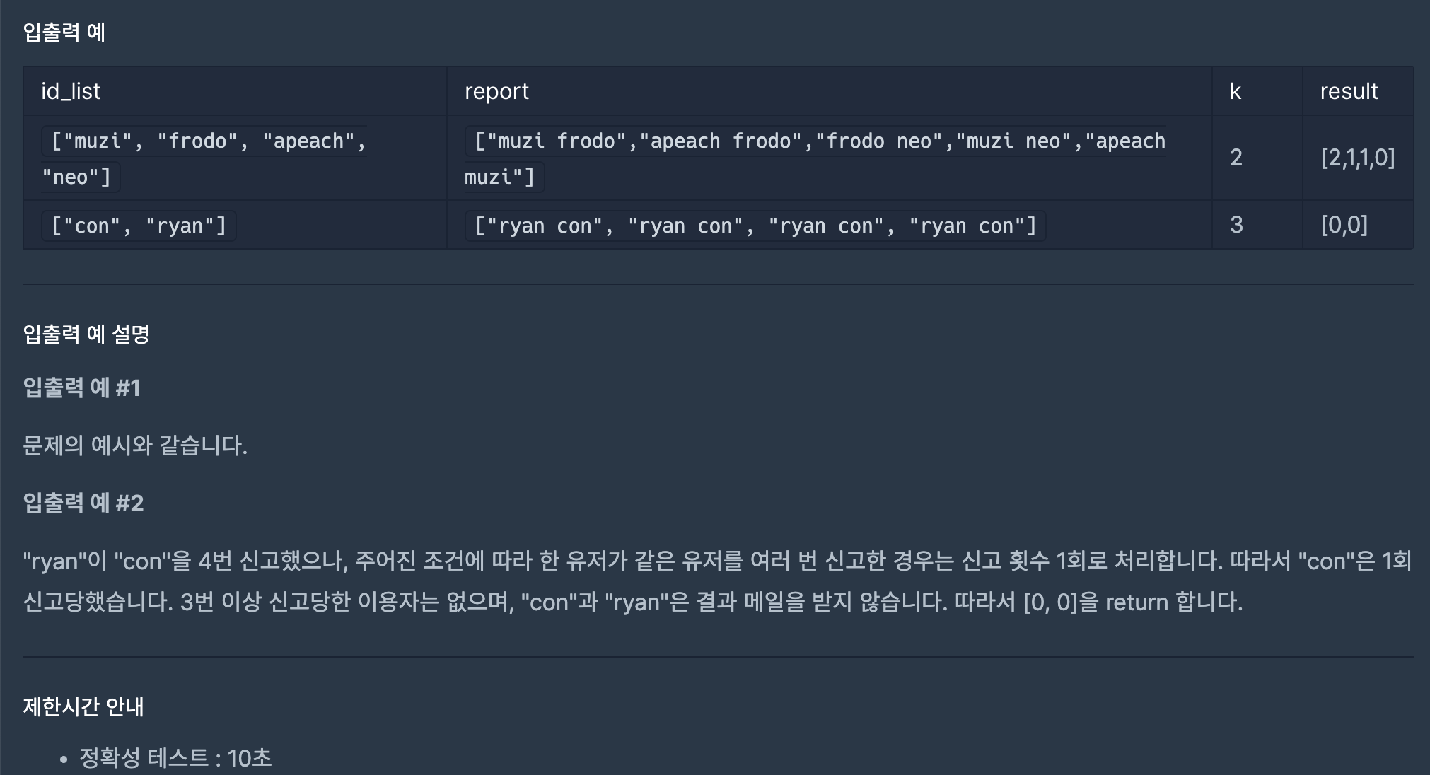 첫번째 id별 신고한 사람의 뜻은 '[userid] : userid를 신고한 사람의 목록'으로 구성되었다는 의미이다.